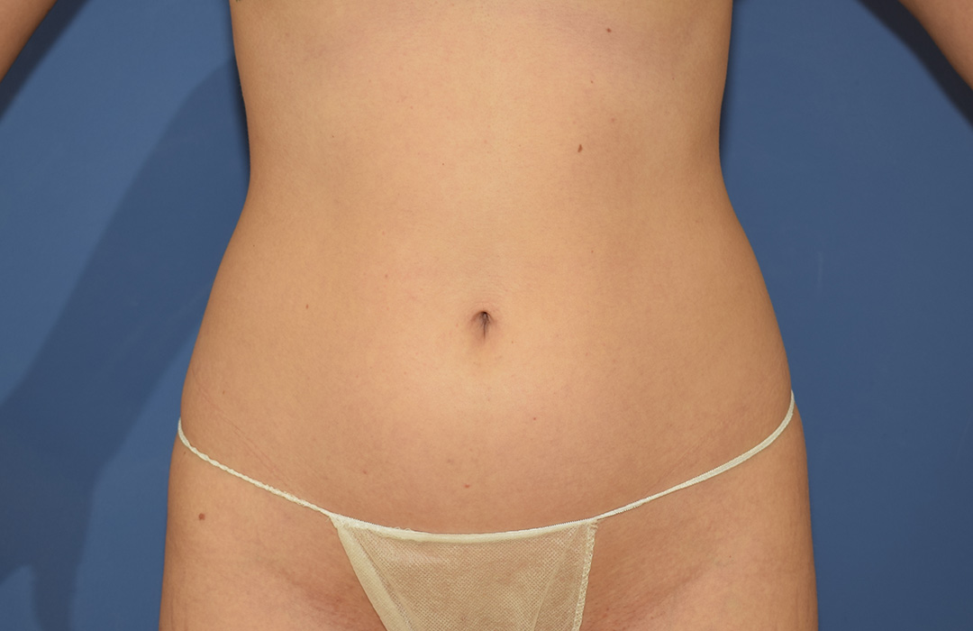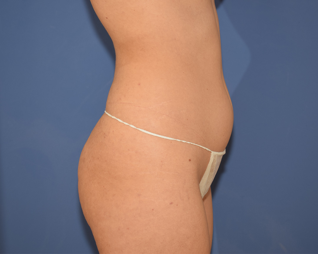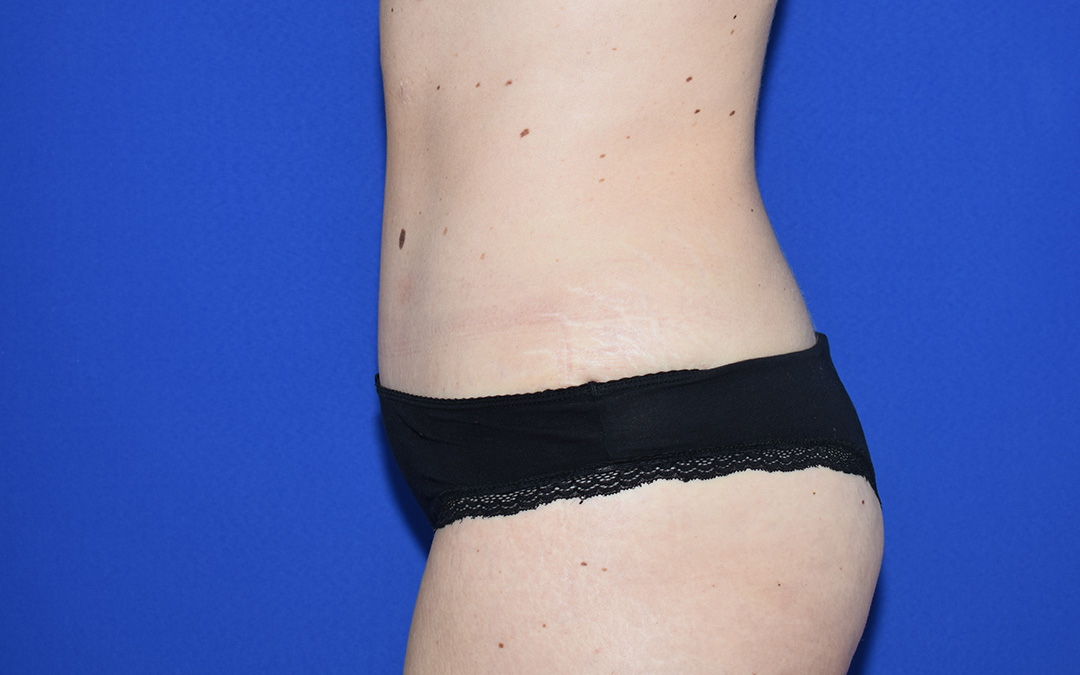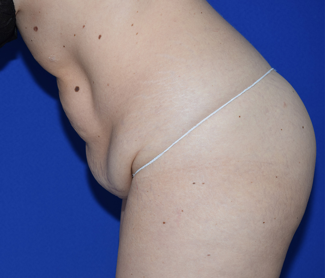 Die Patientin stört der Bauch- und Flankenbereich. Es gibt hier einige Bindegewebsdefizite, diese stören sie jedoch nicht massiv. Das Vorwölben des Fettgewebes im Unterbauchbereich und auch im Flankenbereich sind fĂŒr die Patientin am meisten störend. Sie möchte nicht gerade werden sondern eine schöne Kontur haben.