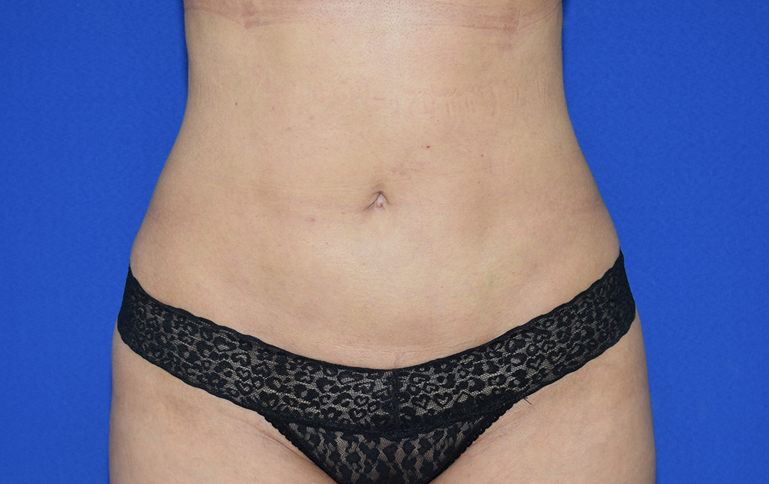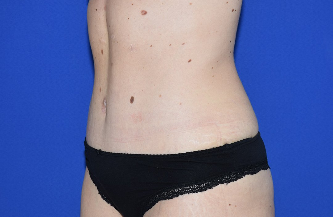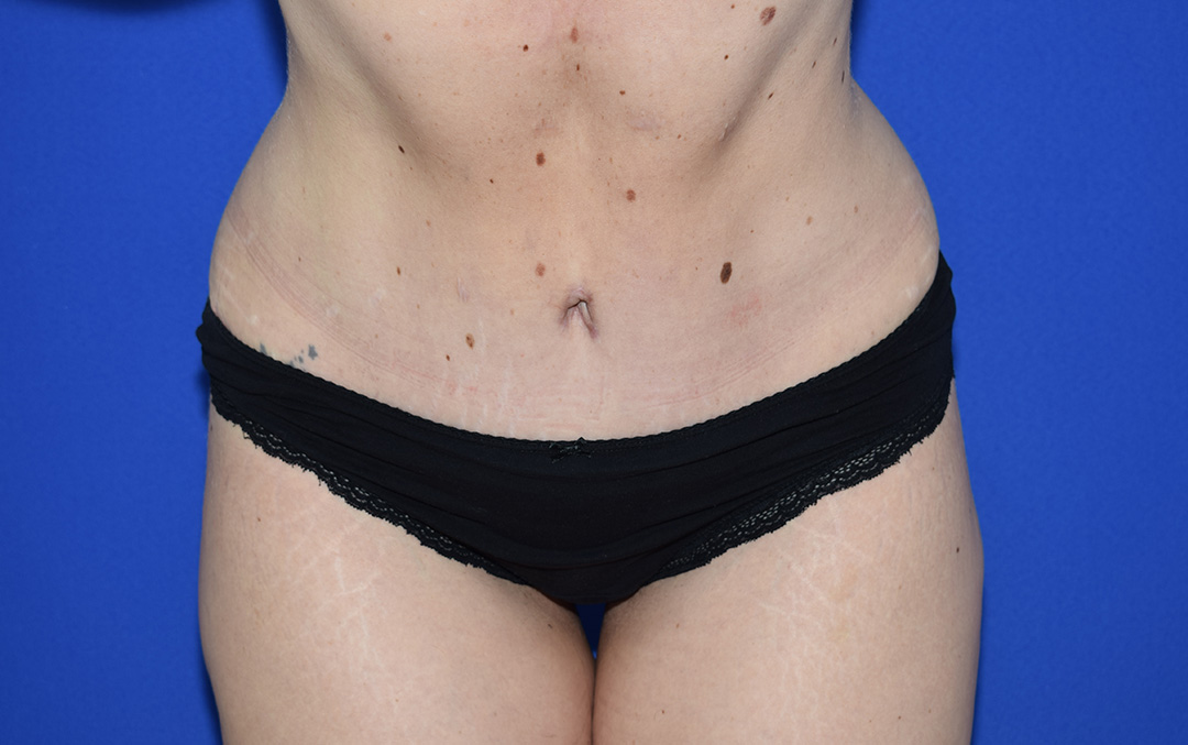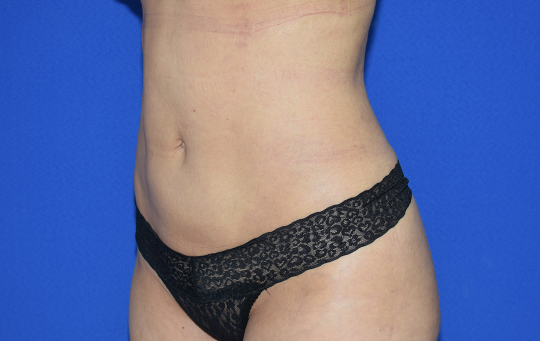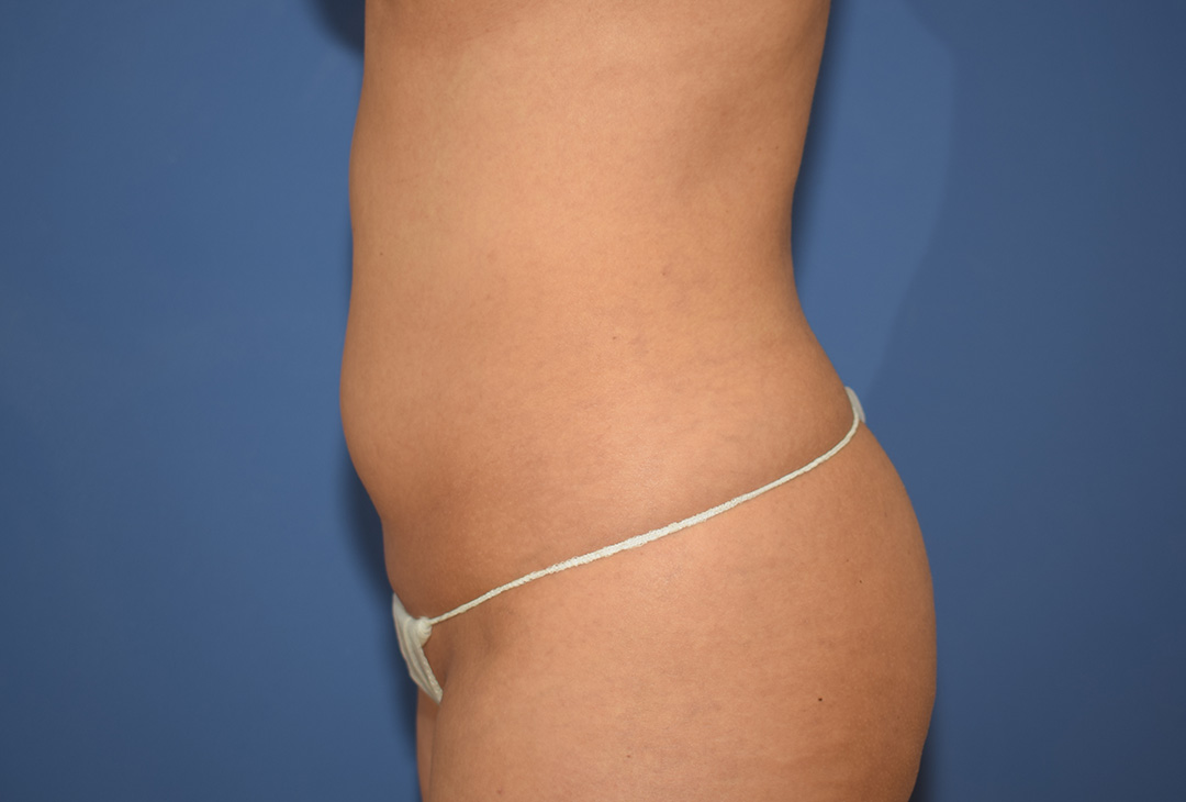 Die Patientin stört der Bauch- und Flankenbereich. Es gibt hier einige Bindegewebsdefizite, diese stören sie jedoch nicht massiv. Das Vorwölben des Fettgewebes im Unterbauchbereich und auch im Flankenbereich sind fĂŒr die Patientin am meisten störend. Sie möchte nicht gerade werden sondern eine schöne Kontur haben.